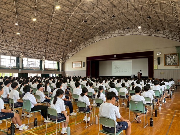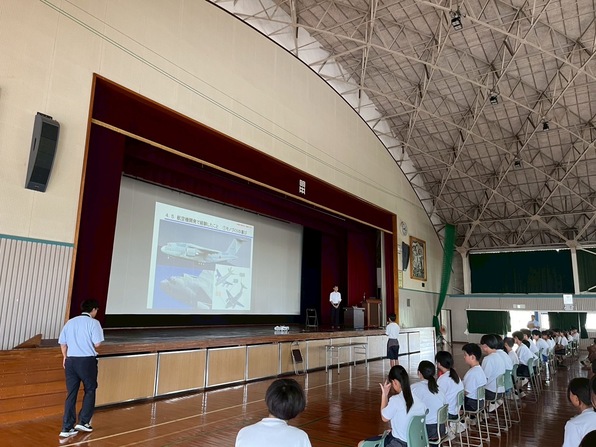 2025年9月18日(木)には、安城市立明祥中学校の全校生徒410名を対象とした出前講座を開催しました。航空機の開発・製造経験者である一般社団法人中部航空宇宙産業センター(C-ASTEC)の平上雄一氏に講師を務めていただき、航空機産業の概要や航空機開発の経験等について講義いただきました。
