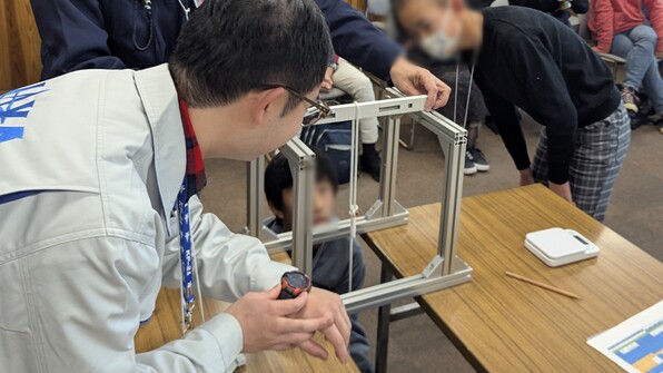 後半は、航空機設計で重要な「軽くて強い」構造を体験するワークショップを実施しました。JAXA研究員による講義をもとに、チームに分かれて厚紙で5kgの重さを支える「梁」を製作し、その軽さを競いました。