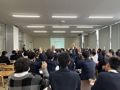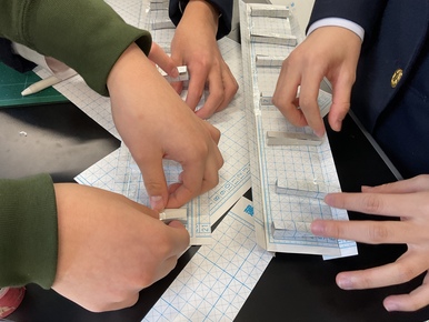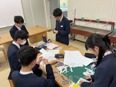 2025年12月11日(木)には、愛知県立明和高等学校附属中学校にて中学1年生91名を対象とした出前講座を開催しました。航空機の開発・製造経験者である一般社団法人中部航空宇宙産業センター(C-ASTEC)の伊藤一宏氏に講師を務めていただき、航空機に関わる最新情報や航空機開発の経験、キャリアの中で感じたことについて講義いただきました。また、講義後にはワークショップを実施し、グループごとに厚紙で「梁」を製作しました。4kgの重りを吊るして耐えられるかを試し、どのグループが最も軽い梁を作れるか競いました。軽くしながら強度を保つために、形や構造を工夫しながら試行錯誤する過程で、協力して設計する楽しさを体感していただけたと思います。